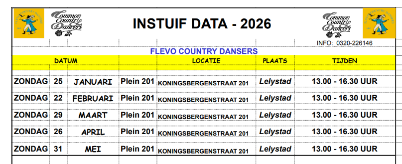 We kunnen dansen van 13.00 uur tot 16.30 uur (wij kunnen vanaf 12.30 uurde zaal in orde brengen) pas als de zaal gereed gemaakt is mag men naar binnen.